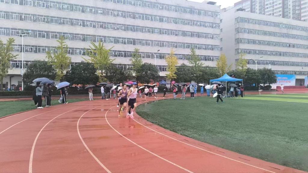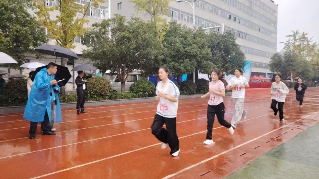 比赛依始,天空飘起淅沥沥沥的小雨,雨水未浇灭运动的热情,反而激发了师生们的斗志。“风雨无阻”不再是口号,而是赛场上最真实的写照。跑道上,运动员们迎着雨点奋力冲刺,每一步都踏出水花,踏出坚韧,用实际行动诠释体育精神的内涵。田赛场上,湿滑的场地增加了挑战,每一次投掷、每一次跳跃都更加全力以赴。铅球赛场更是打破了学院运动会记录,不畏艰难、坚持到底的体育精神熠熠生辉。