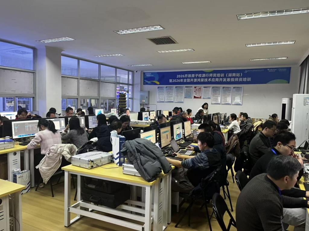 近日,由全国新一代自主安全计算系统行业产教融合共同体与全国新一代智能信息系统行业产教融合共同体联合指导,我院与拓维信息系统股份有限公司(以下简称“拓维信息”)及旗下子公司湖南开鸿智谷数字产业发展有限公司(以下简称“开鸿智谷”)联合承办的“2026开放原子校源行师资培训暨全国开源鸿蒙技术应用开发寒假师资培训(湖南站)”在我院顺利举办。我院党委委员、副院长谭立新,拓维信息、开鸿智谷产业与人才发展部总裁邓娟及校企代表参加开班仪式。