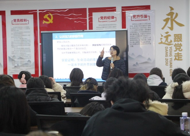 讲座伊始,谭鑫用一场别开生面的互动破冰活动开启了讲座,现场同学起身,为左右相邻的同学揉肩捶背。简单的肢体互动瞬间拉近距离,同学们在欢声笑语中卸下拘谨,现场氛围迅速变得热烈而温暖。讲座围绕“压力是什么”“压力的双面性”“压力调适实用方法”三大核心问题展开深入讲解,结合大学生学习、社交、职业规划等常见场景,用通俗易懂的语言剖析压力的本质,指出适度压力是推动成长的动力,过度压力则可能成为发展的阻碍,帮助同学们正确认知压力、理性看待压力。
