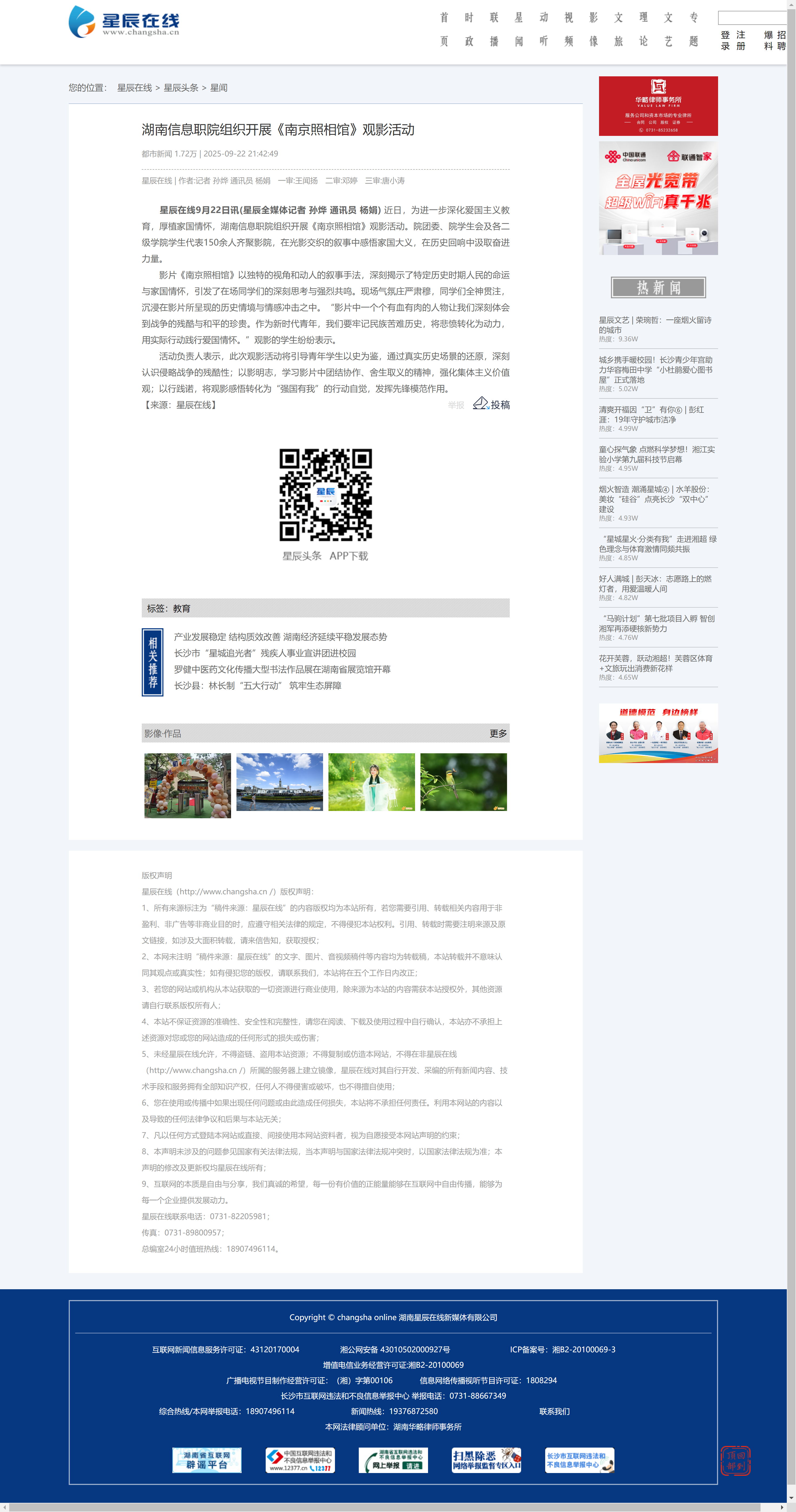9月22日,星辰在线发布《湖南信息职院组织开展《南京照相馆》观影活动》