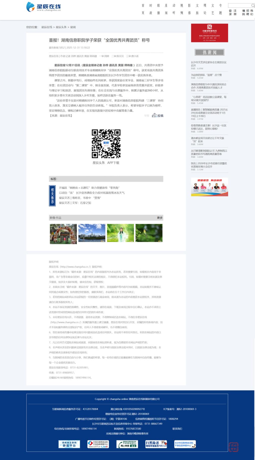 12月29日,星辰在线发布《喜报!湖南信息职院学子荣获“全国优秀共青团员”称号》