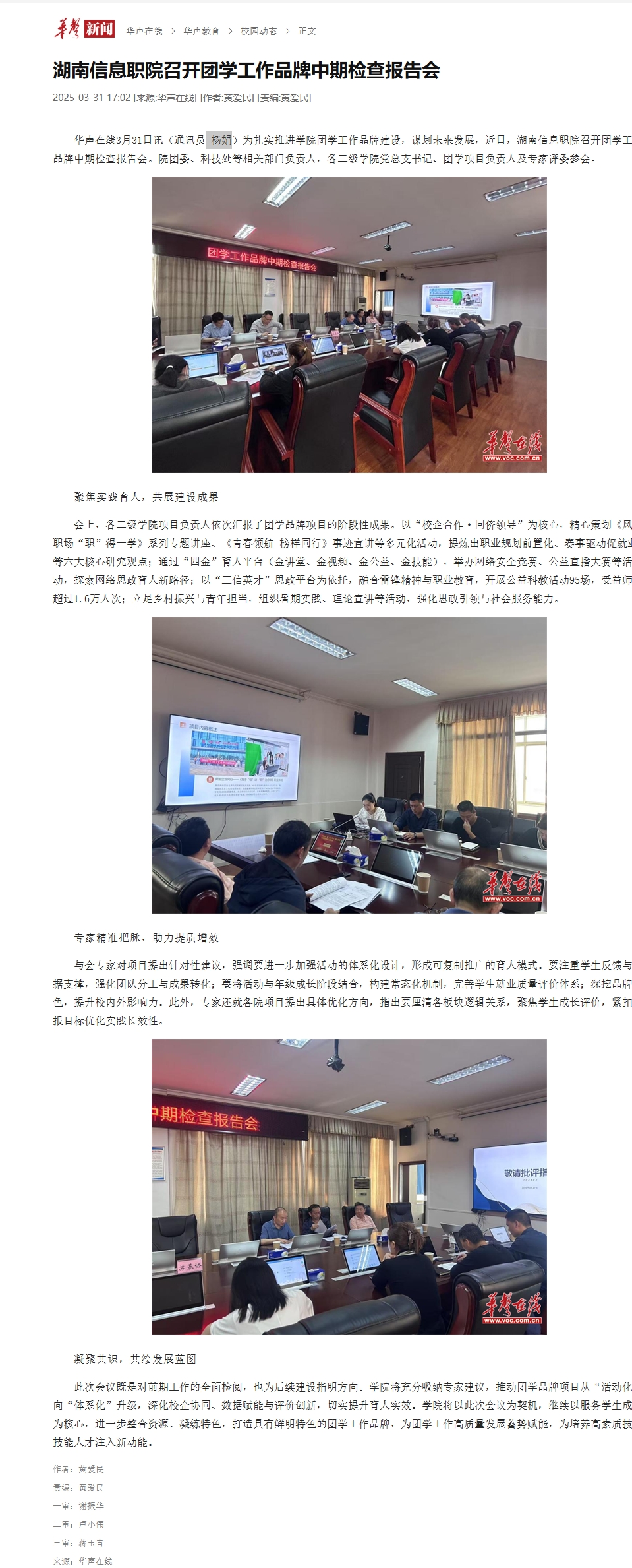 3月31日,华声在线发布《湖南信息职院召开团学工作品牌中期检查报告会》。