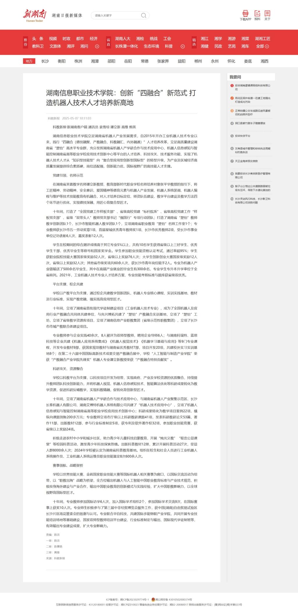 5月7日,新湖南发布《湖南信息职业技术学院:创新“四融合”新范式 打造机器人技术人才培养新高地》